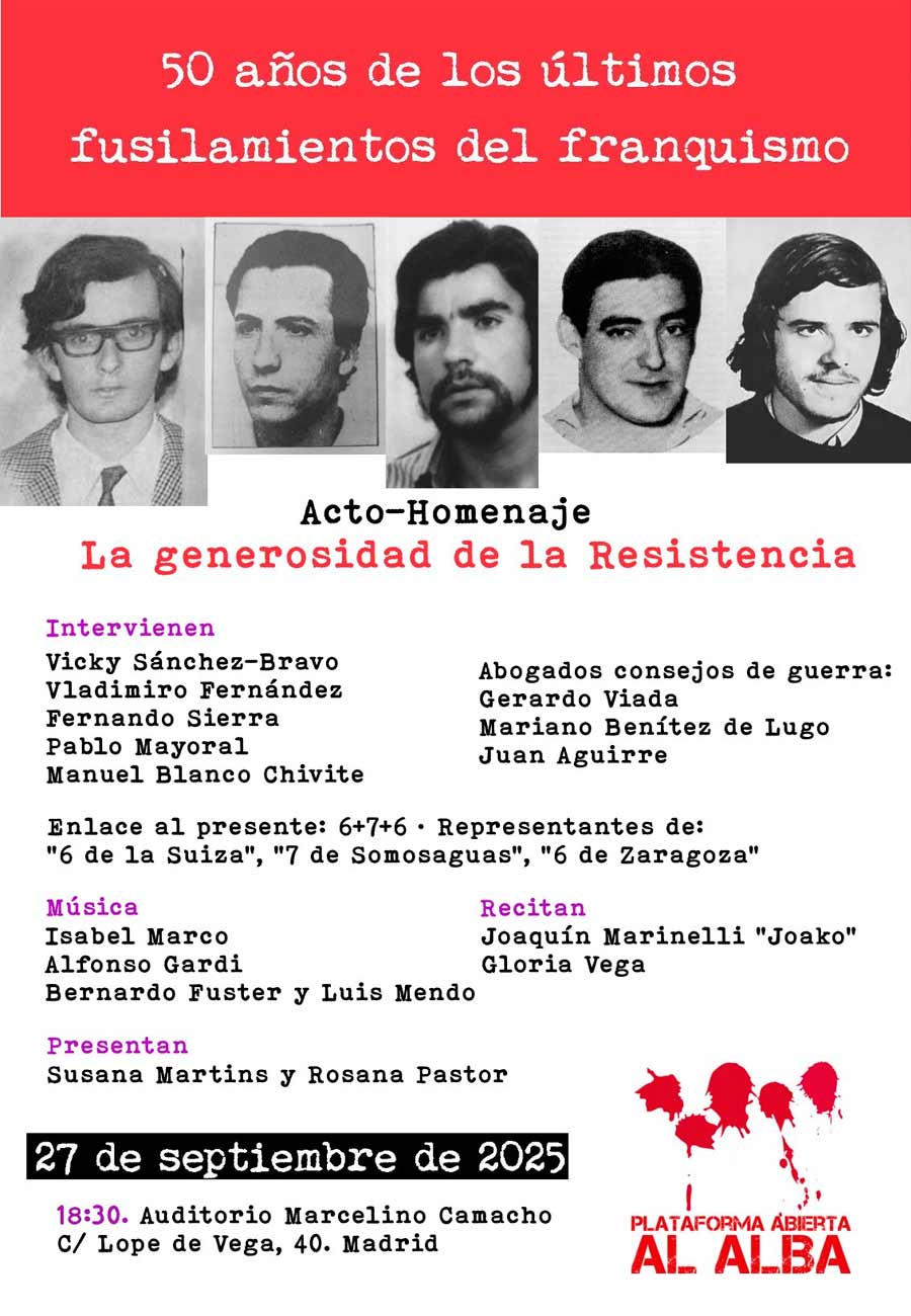 El 27 de septiembre a las 18:30 tenemos una cita en el Auditorio Marcelino Camacho para volver a hacer un merecido homenaje a los asesinados aquel fatídico amanecer del 27 de septiembre de 1975 y a tantas y tantos resistentes antifascistas anónimos que lo dieron todo para echar abajo a la sanguinaria dictadura de Franco y acabar con la opresión capitalista.