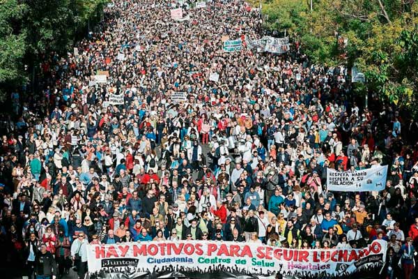 Ha sido el movimiento por abajo, de cientos y miles de activistas en asambleas por la sanidad pública, asociaciones de vecinos, plataformas y movimientos sociales los que han dado cauce y forma a un descontento que ya no podía más. Son esas manos y esas cabezas las que se han puesto a la obra desde hace meses para defendernos de la demolición de la sanidad pública. Así ocurrió este verano en las calles de Parla, Leganés, Getafe y otras ciudades obreras. Pero ahora hemos dado un salto de gigante. El trabajo de pico y pala, desde abajo, explicando en los barrios, ambulatorios, en el metro, colgando pancartas en los autobuses, agitando y organizando una respuesta unitaria, ha conectado con el sentir general.