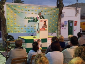 Santiago Jiménez, candidato al parlamento por Sevilla, y alcalde de la localidad, junto a Juan Manuel Sánchez Gordillo, también candidato al parlamento fueron los encargados de dirigirse a los asistentes, comenzando el primero hablando sobre la necesidad de evitar que la derecha no conquiste Andalucía, de lo que ello supondría en el plan tejido por el capital para acabar no sólo en nuestra comunidad sino en la totalidad del Estado, con las conquistas sociales y económicas de la clase trabajadora. De igual manera, acusó y responsabilizó a la dirección socialista y a su gobierno de facilitar estas políticas comenzando la tarea encomendada por los llamados “mercados” en el Estado Español, llevando al callejón sin salida que supone la política de ataques y recortes a los trabajadores.