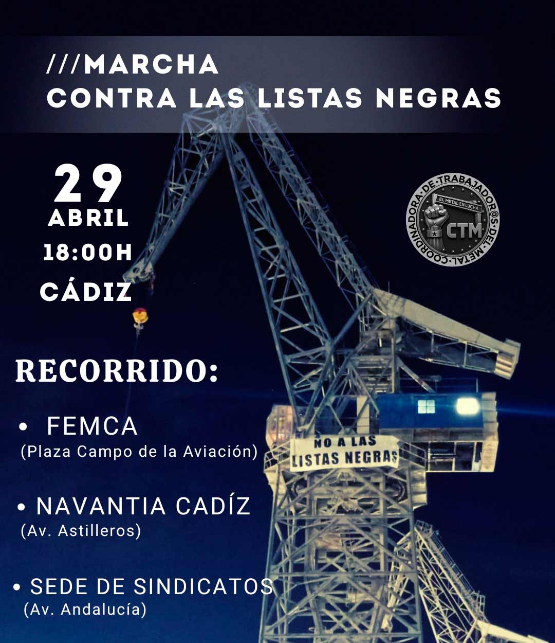 El próximo miércoles 29 de abril la Coordinadora de Trabajadores del Metal convoca una marcha para exigir, una vez más, el fin de las listas negras que las empresas del metal de la bahía de Cádiz, encabezadas por el astillero estatal Navantia, tienen elaboradas para reprimir a las y los trabajadores que luchan por sus derechos y por unas condiciones de trabajo dignas para todos.