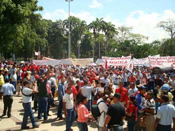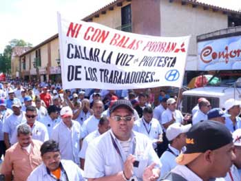 Más de 1500 obreros y empleados unidos contra la criminal agresión del pasado Jueves 29, conmovidos por el asesinato de dos trabajadores que resistían con sus camaradas la embestida fascista de tres cabezas: la gerencia patronal de Mitsubishi, el poder judicial representado por un tribunal mercantil y los oficiales y policías del estado que tenían que hacer el trabajo sucio. ¡De nuevo arremete el estado burgués contra los trabajadores revolucionarios! Con los puños en alto y en una sola voz alzada con dignidad gritaban ¡ no tenemos miedo!. La marcha tuvo una amplia difusión en los medios de comunicación nacionales, apareciendo, por ejemplo, un reporte en el informativo matinal de VTV.