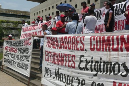 Cerca de 500 trabajadores de MMC automotriz y organizaciones revolucionarias marcharon por Barcelona hasta el palacio de justicia para entregar un documento a la Juez Rectora y Juez del Contencioso Administrativo Ciudadana, Mirna Mass Rubí Sposito previo a la presentación del recurso de nulidad contra el procedimiento administrativo que dicta el ministerio del trabajo para despedir a 11 directivos sindicales y 2 delegados de prevención, con el objetivo de exhortar el debido cumplimiento del procedimiento judicial con el nivel de ética y moral que requiere el caso, de igual manera hacerle de sus conocimiento la actual situación que conllevo a esta movilización protestar y exigir el reenganche de 254 trabajadores despedidos injustamente por la empresa y complacida por el ministerio del trabajo, exigir el cumplimiento del decreto de inamovilidad laborar y protección política laboral a los mas 200 trabajadores con enfermedades generadas por la empresa, exigir también el cumplimiento y sinceridad del Gobierno Tarek William en las indemnizaciones a los familiares de los dos trabajadores asesinados por la policía y la indemnización al trabajador herido de bala. Los trabajadores marcharon y corearon consignas durante el recorrido, como exigiendo donde están los asesinos intelectuales!!!!, fuera los Burócratas de la Revolución!!!!!. Expropiación de la Empresa de Vidrios VIVES,