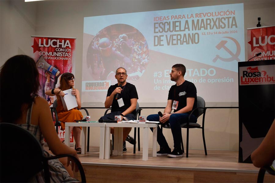 En la sesión del sábado 13 las ideas de Lenin sobre el Estado y la cuestión nacional protagonizaron los dos paneles de la mañana. En el primero, Rubén Fernández y Marina Mata, de la Comisión Ejecutiva de Izquierda Revolucionaria, junto a Raúl Rivas, de IR en Madrid, explicaron a fondo que el Estado, desde su nacimiento, ha sido un instrumento de opresión de una clase sobre otra.